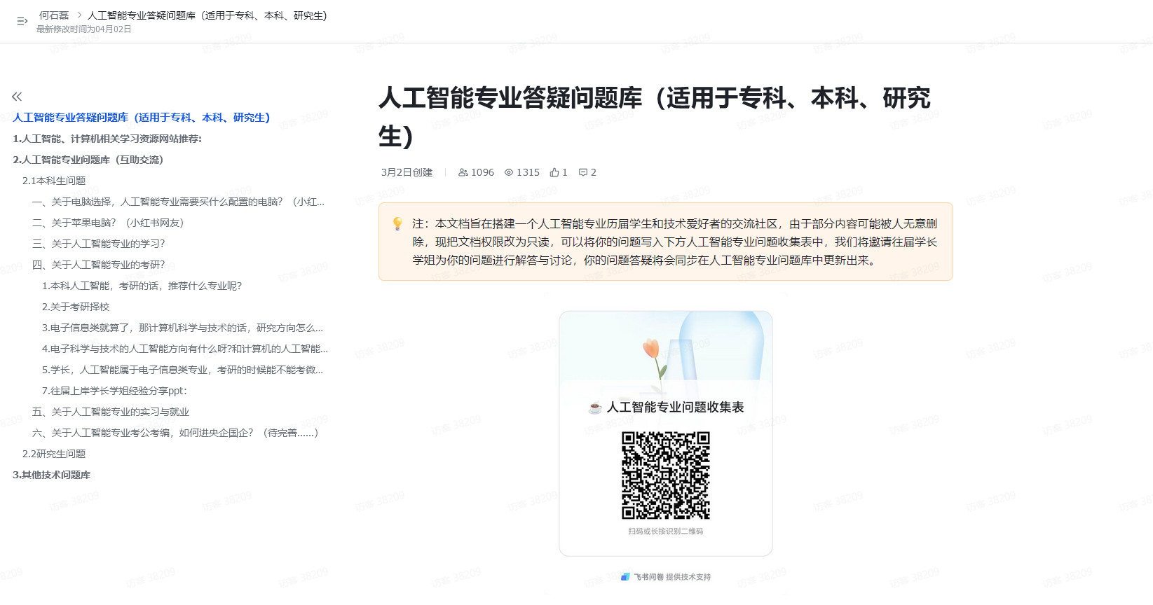 本文档旨在搭建一个人工智能专业历届学生和技术爱好者的交流社区,由于部分内容可能被人无意删除,现把文档权限改为只读,可以将你的问题写入下方人工智能专业问题收集表中,我们将邀请往届学长学姐为你的问题进行解答与讨论,你的问题答疑将会同步在人工智能专业问题库中更新出来。