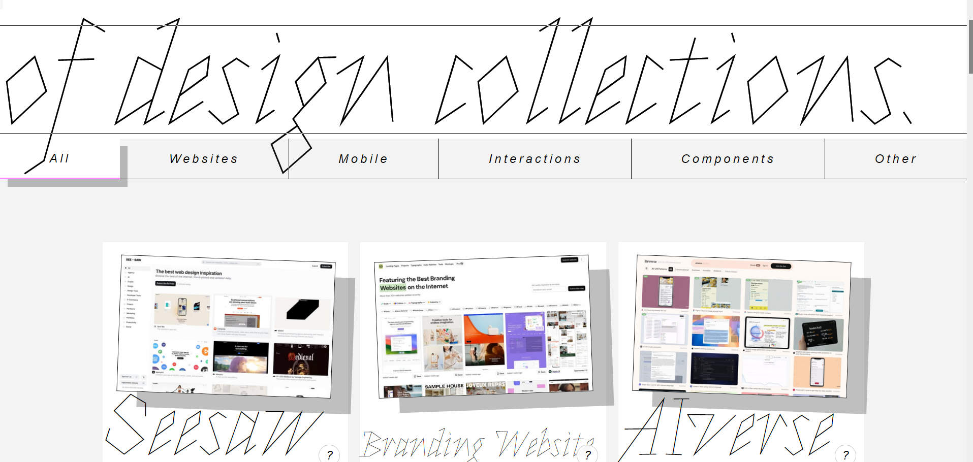 Collection Directory 是一个搜罗各种优秀产品设计资源的目录库,收集的网站都专注搜罗某一领域的优秀产品设计范例,包括网页设计类、移动APP类、交互设计类、组件类、其他(品牌设计类)几大类,涵盖了产品设计的各个领域。不管是新手还是资深设计师,都可以从这些优秀产品设计中获取产品设计的灵感。