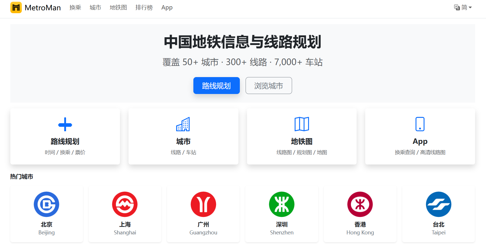 MetroMan地铁通是一个覆盖中国超过50座城市、300多条线路、7000多个地铁站点的轨道交通信息平台。自2011年上线以来,始终以“清晰、准确、易用”为核心理念,帮助用户快速规划地铁出行路线,实时获取票价、首末班车时间及换乘方案。支持 iOS、Android、小程序与网页版,其中网页版于2025年推出,主打智能换乘、城市排行榜与交互式地铁图。