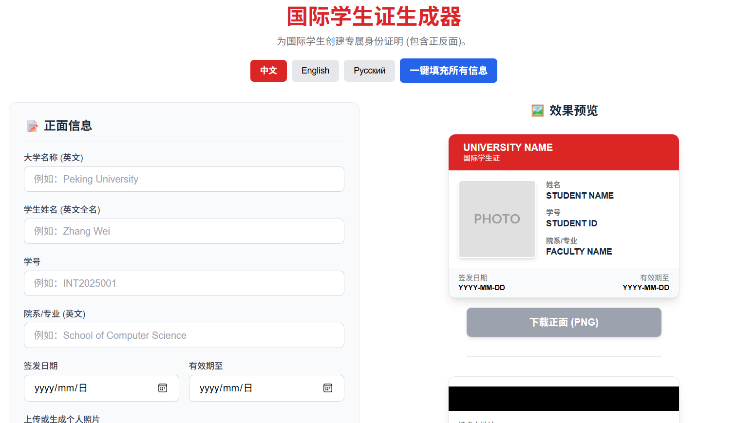 国际学生证生成器是一个基于 HTML、CSS、JavaScript 的国际学生证生成器示例工具,用于学习与测试前端能力。用户可在页面中录入学校与个人信息,生成包含正面与背面的学生证效果图,并支持预览与下载。该工具仅限教学与个人娱乐,严禁将生成内容用于任何身份识别、认证或商业场景。