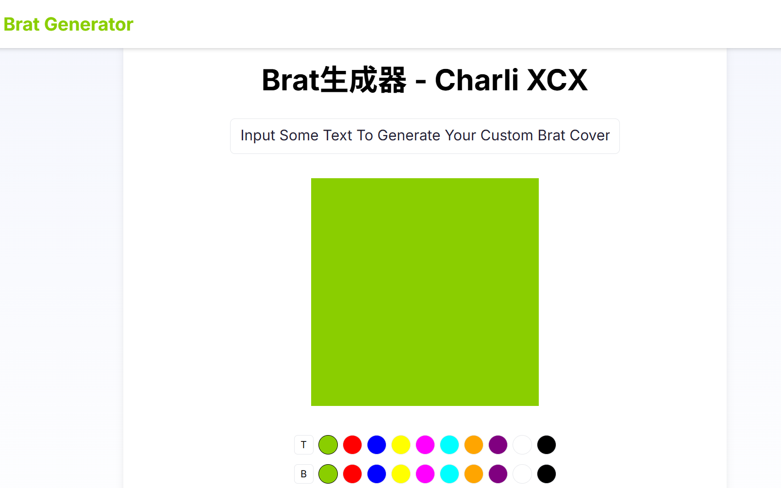Brat生成器(Brat Generator) 是一个受Charli XCX专辑《Brat》启发的创意工具,允许用户在线制作风格独特的文本图像。你可以自由输入文字,自定义字体、颜色与背景,快速生成与专辑封面相似的视觉效果,呈现出标志性的“Brat绿”和大胆小写排版。