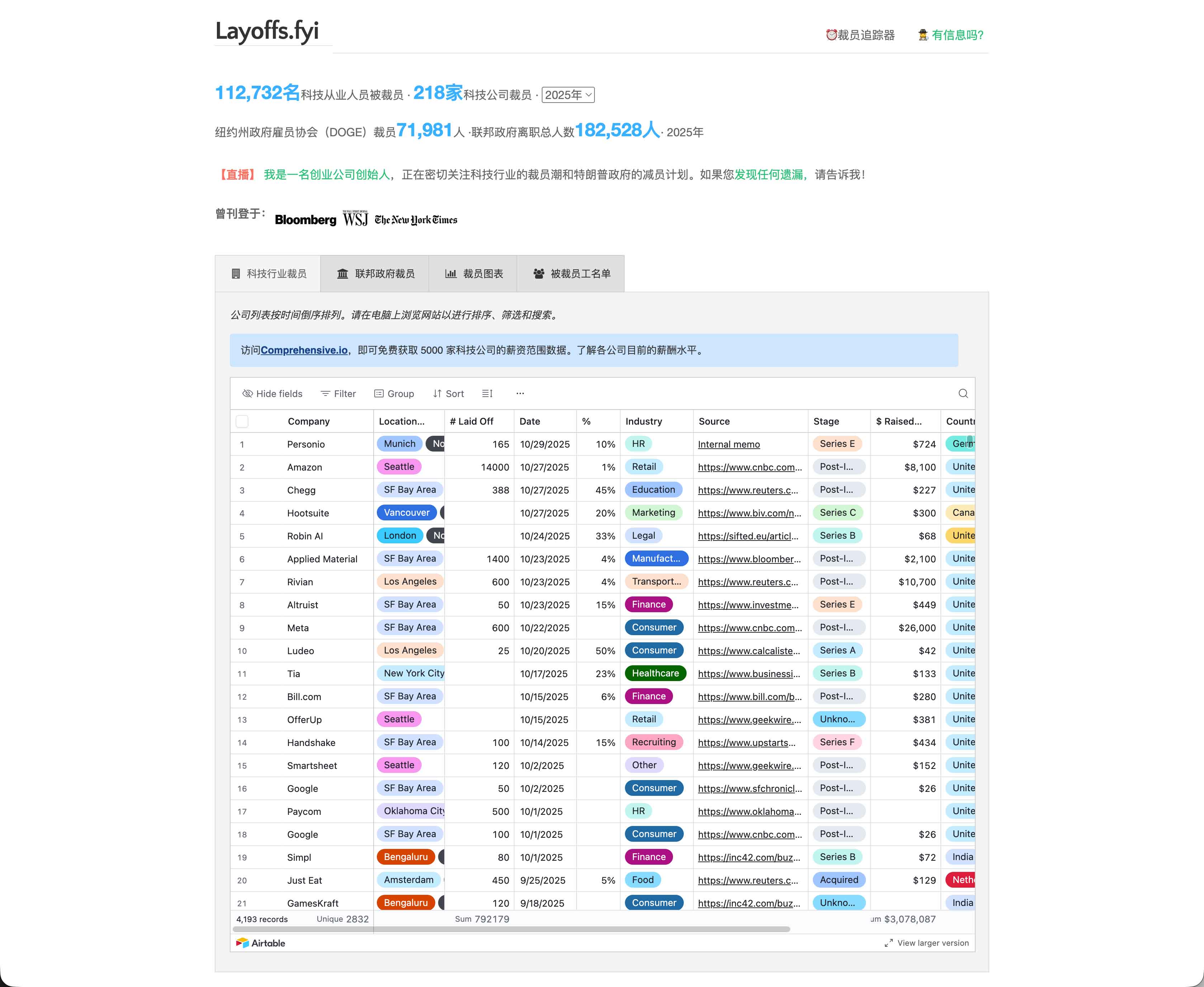 Layoffs.fyi 是一个专注于记录科技行业与美国政府裁员信息的网站,汇集了来自公开媒体报道与官方公告的实时数据。该平台为公众、投资者和招聘方提供清晰透明的劳动力市场趋势。