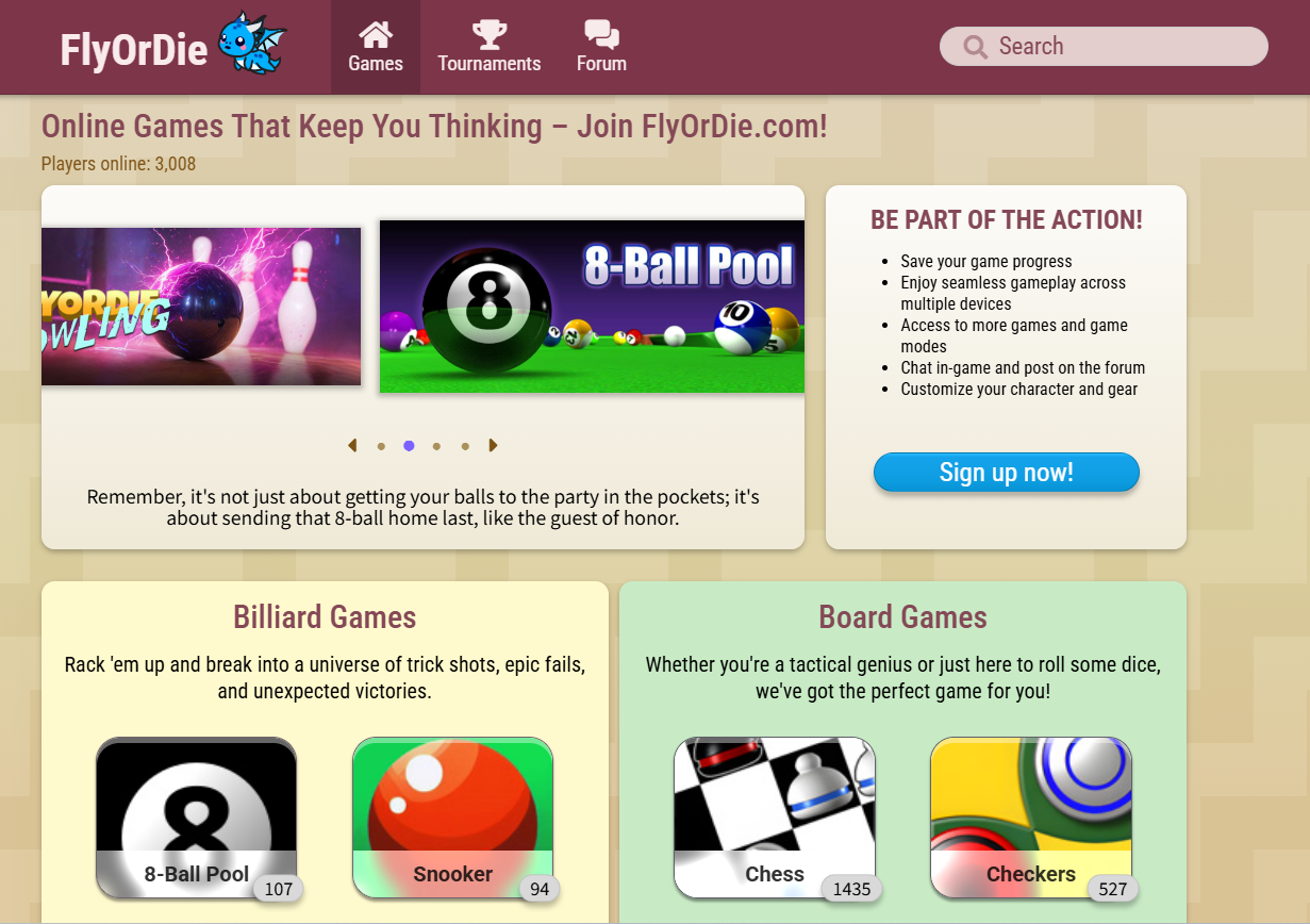 FlyOrDie 是一个在线联机小游戏平台,支持与全球真实玩家对战。棋类、体育与策略玩法一应俱全,覆盖国际象棋、跳棋、连四、黑白棋(Reversi)、西洋双陆棋(Backgammon)等经典项目,以及台球、保龄球、冰壶等热门体育玩法。平台基于浏览器运行,无需安装,打开即可开始对局。