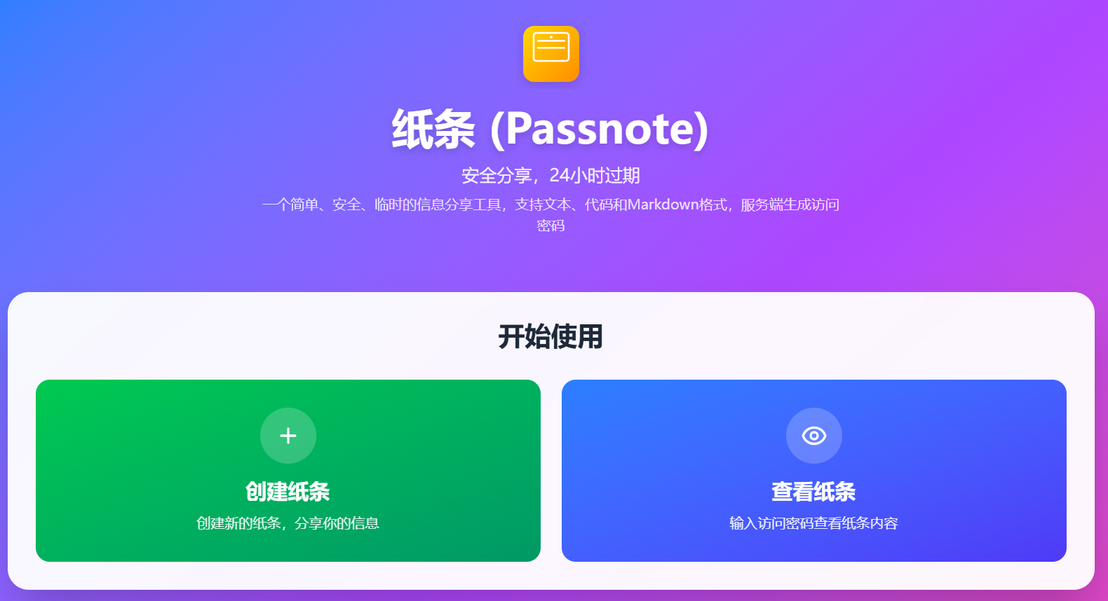 Passnote (纸条) 是一款简单、安全、临时的信息分享工具。它支持文本、代码和 Markdown 格式,服务端生成访问密码,并且 24 小时后自动删除,确保信息安全,不留痕迹。