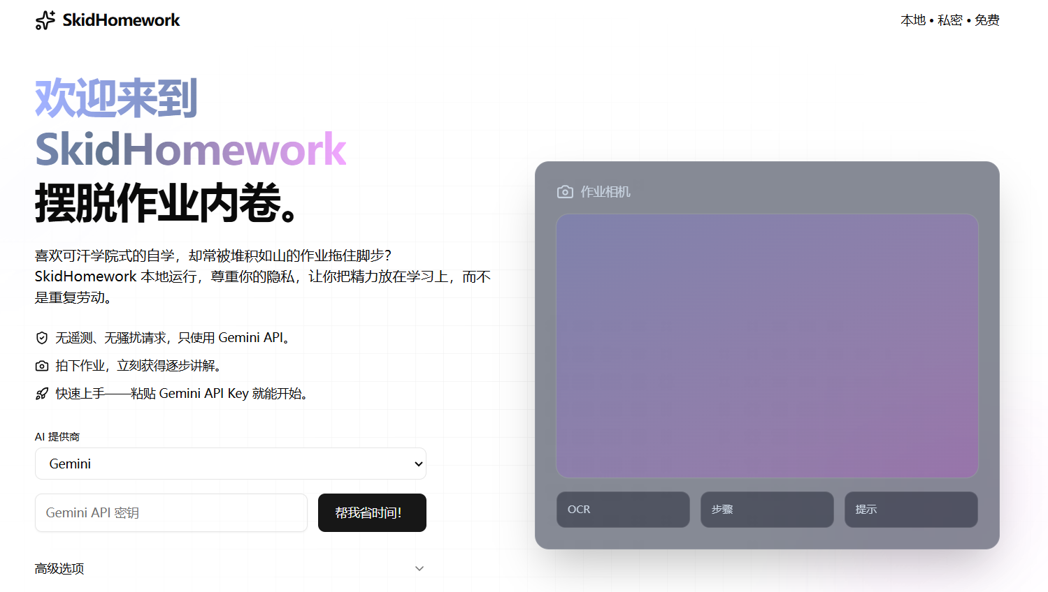 SkidHomework 是一个为学生与自学者打造的开源 AI 作业解答工具。你可以上传作业图片、PDF 文件,甚至用手机拍照识别题目,AI 将快速生成解答思路与答案草稿,帮助用户理解问题背后的知识逻辑。无论是中学生、大学生,还是自主学习者,都能借助这一工具节省查题与计算的时间,专注于真正的学习。