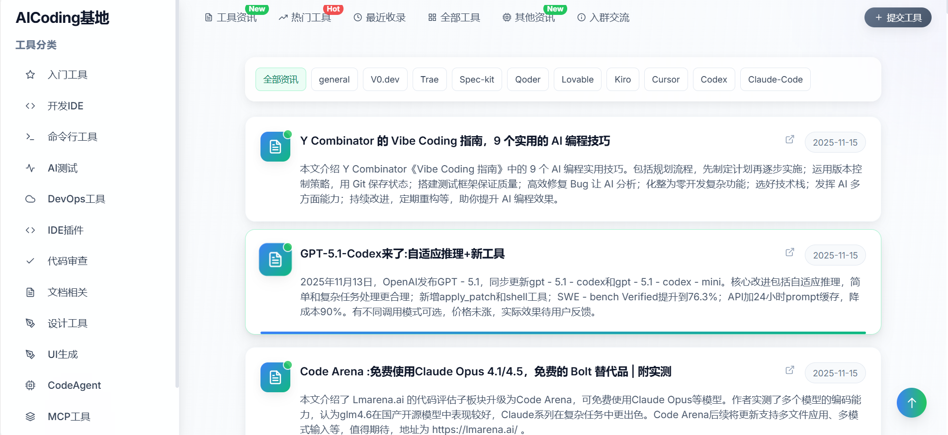 AICoding基地面向广大开发者、独立开发者与技术爱好者,集中整理各类常用的AI编程工具与相关资讯,让零散的信息变得有序,让重复搜索变成一键直达。