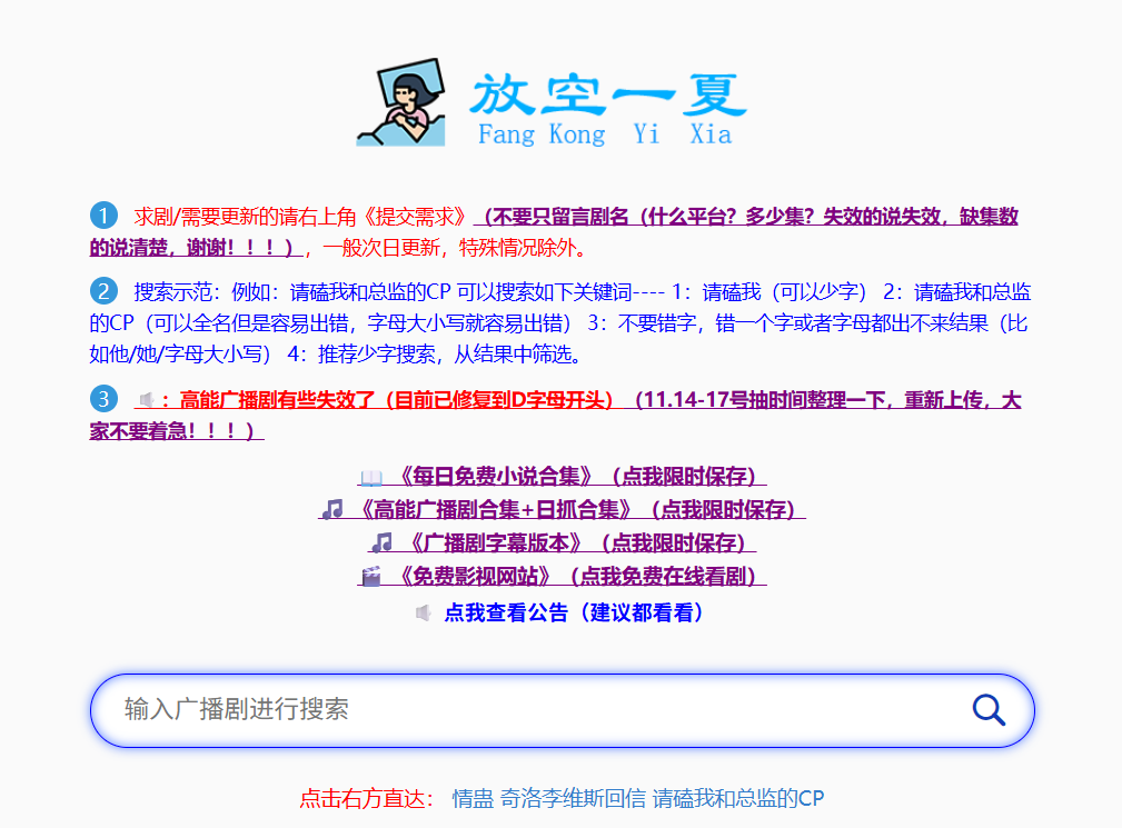 - 寻找资源: 找不到想听的广播剧?来“放空一夏”试试,说不定会有惊喜!